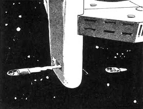 Two identical spacemobiles are housed aboard the space station. One can be fired from a stabilizer, while the second one enters from the opposite side. Space Family Robinson (1962) Artwork by Dan Spiegle